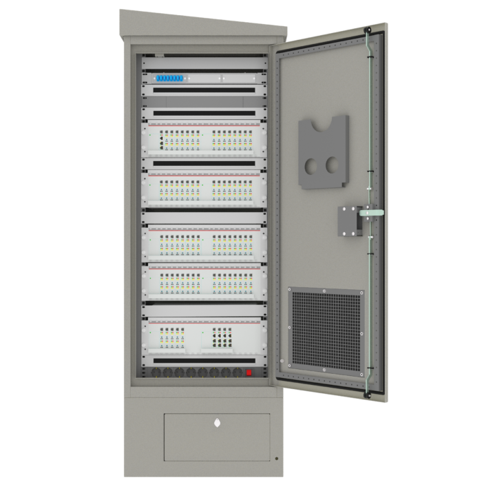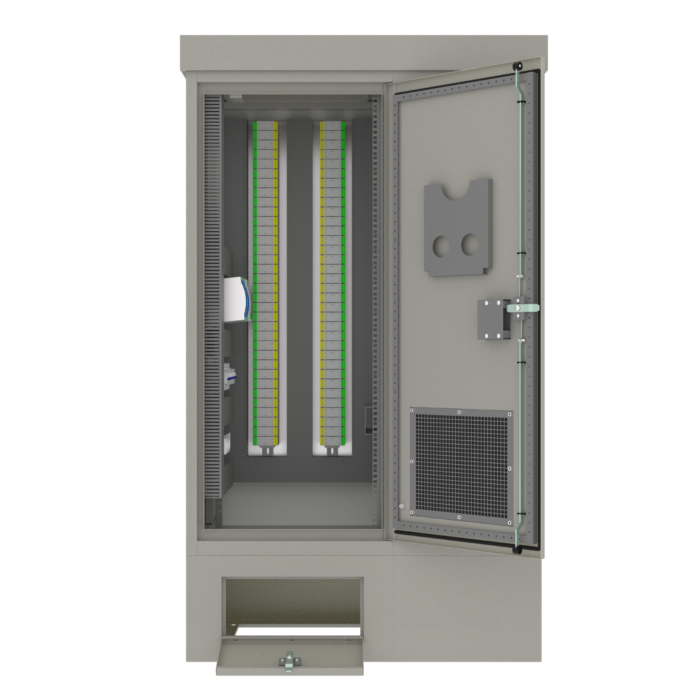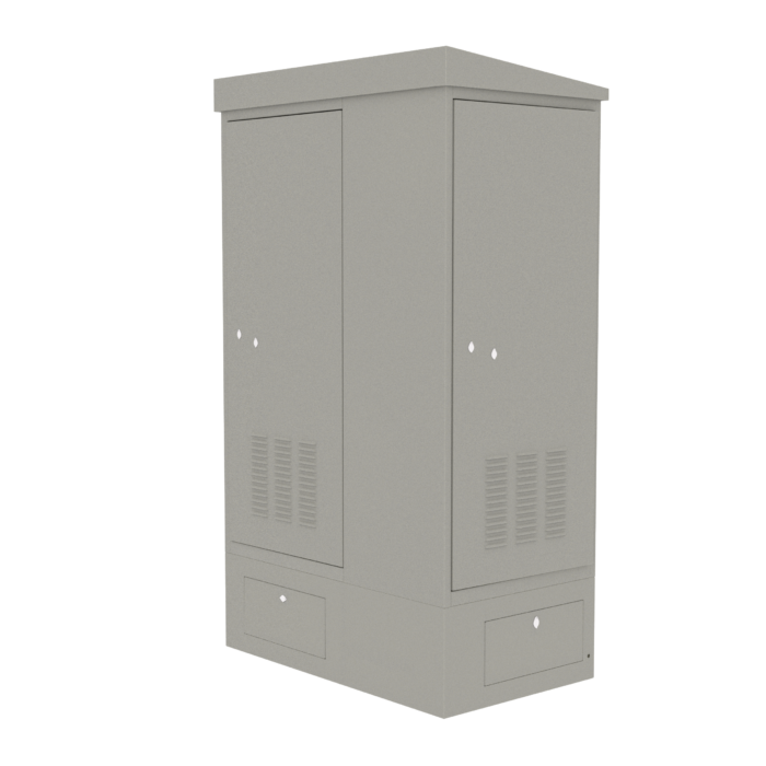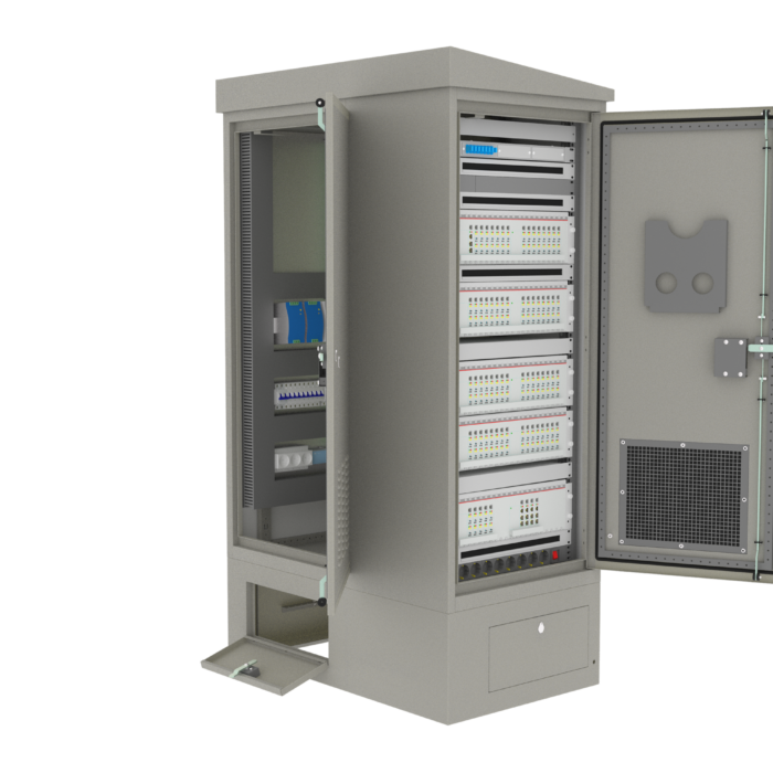 Корпус шкафа изготовлен из металла и рассчитан на эксплуатацию в условиях открытого воздуха и агрессивной среды. Двери шкафа имеют антивандальный механизм. Покатая крыша предотвращает скопление осадков и снижает воздействие внешних факторов на установленное оборудование.
