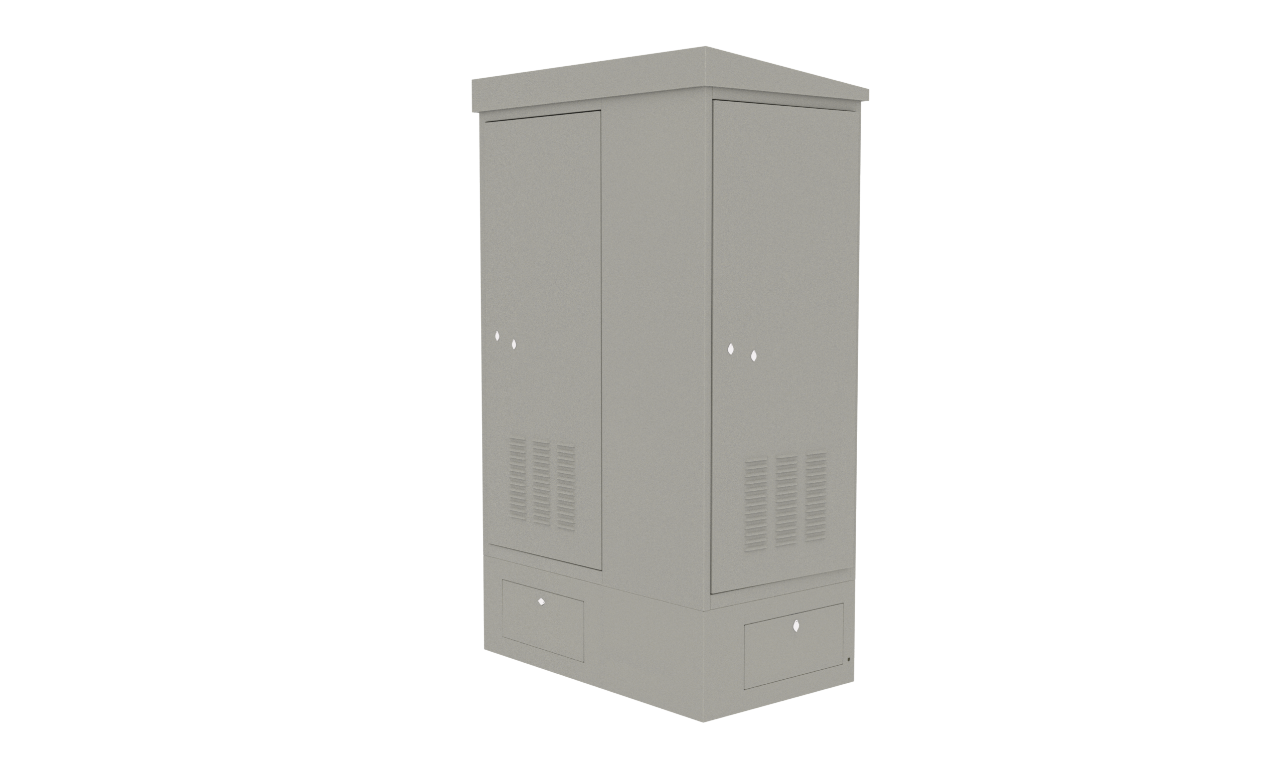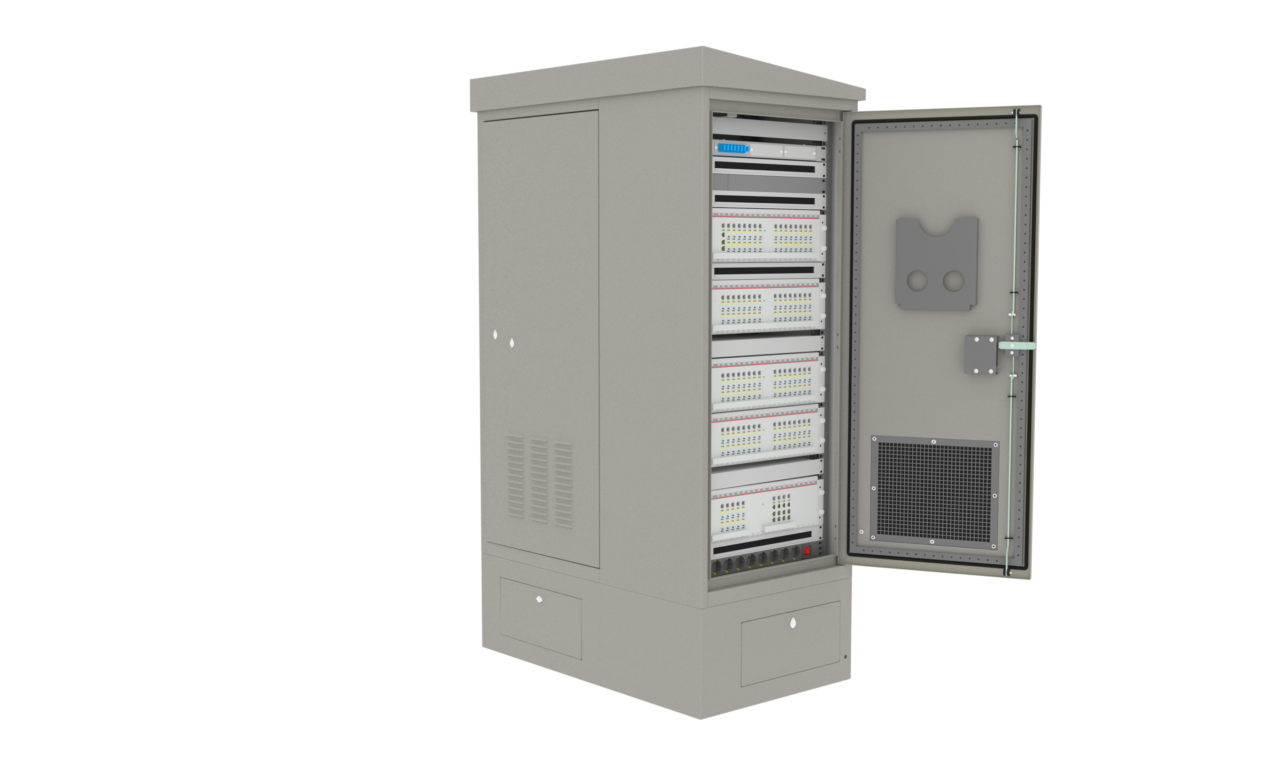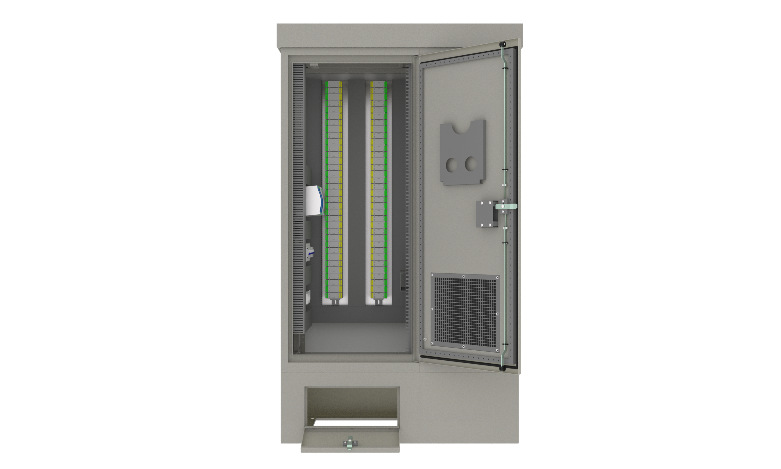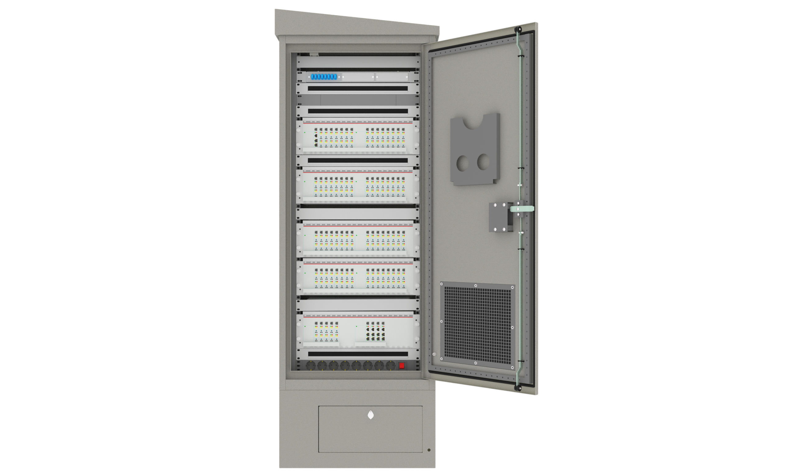 Корпус шкафа изготовлен из металла и рассчитан на эксплуатацию в условиях открытого воздуха и агрессивной среды. Двери шкафа имеют антивандальный механизм. Покатая крыша предотвращает скопление осадков и снижает воздействие внешних факторов на установленное оборудование.